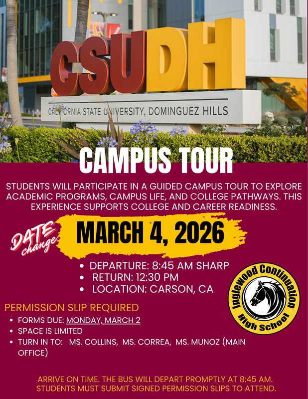 Welcome to Inglewood Continuation High School. As we enter the 2023 - 2024 school year it is our goal to ensure the success of every student. Partnering with parents is so crucial in order to move our school and district instructional plan forward. Our mission is to nurture, educate and graduate students who are self responsible and self disciplined.
